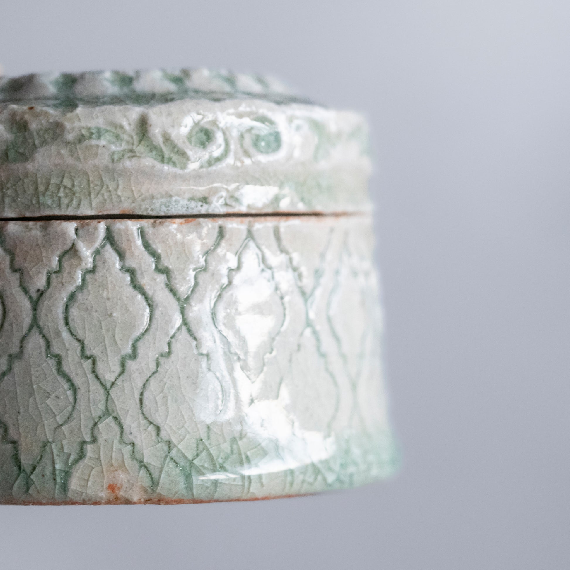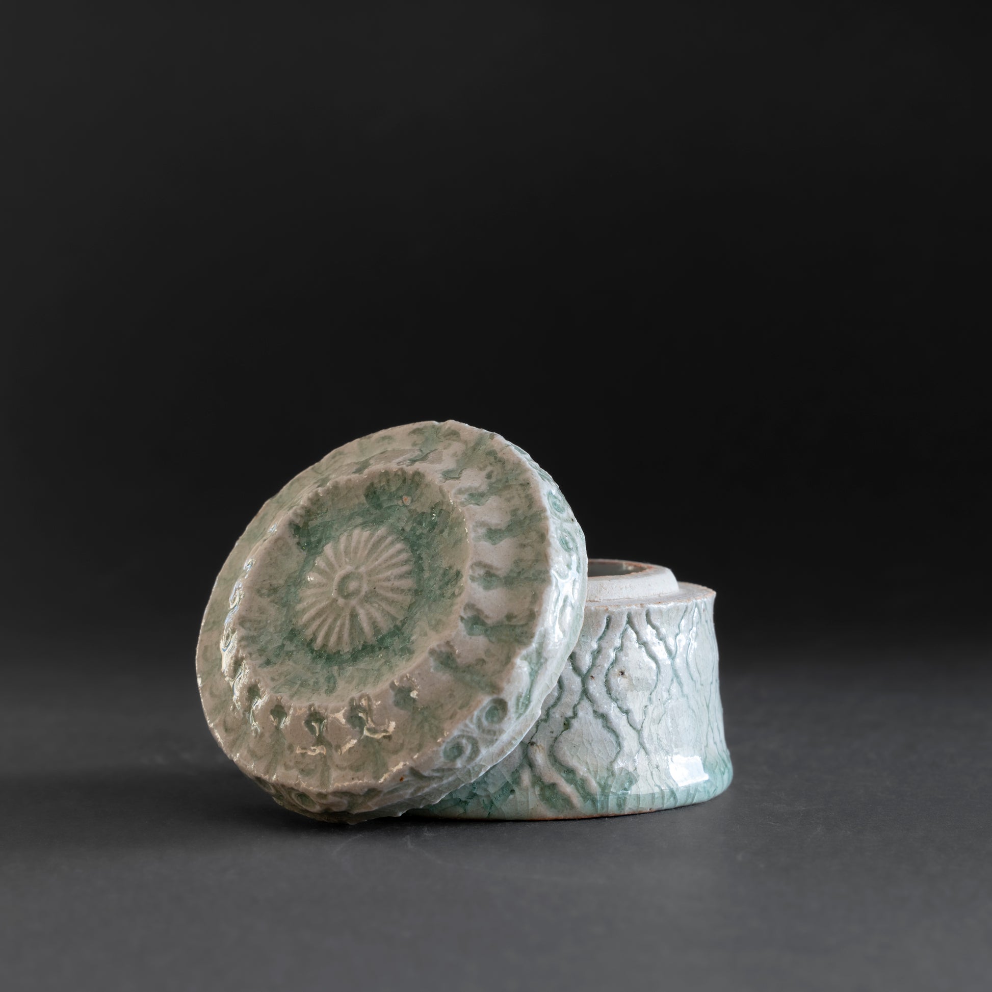 This lidded bowl showcases a softer application of Matsumoto’s ash glaze and zaffer, resulting in a more subdued surface tone. The restrained glaze allows embossed and debossed patterns to stand out clearly, adding depth while maintaining material clarity.