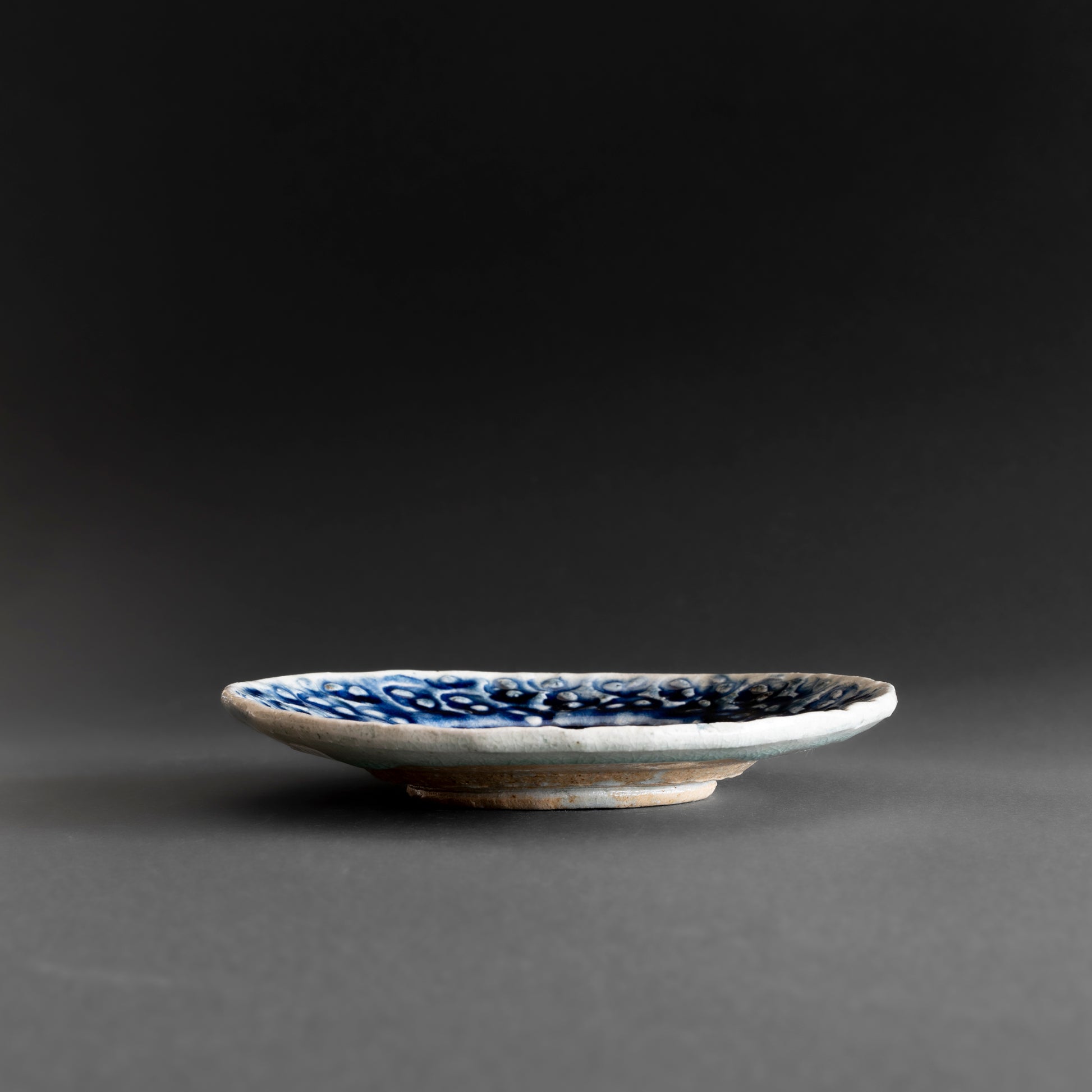 This footed plate reflects Matsumoto’s refined glazing technique, where ash glaze and zaffer fill the embossed surface with controlled movement. Exposed areas of Shigaraki clay remain visible, creating a tactile contrast that emphasizes the material’s character. The glaze settles naturally during firing, forming a glass-like finish shaped entirely by heat and gravity.