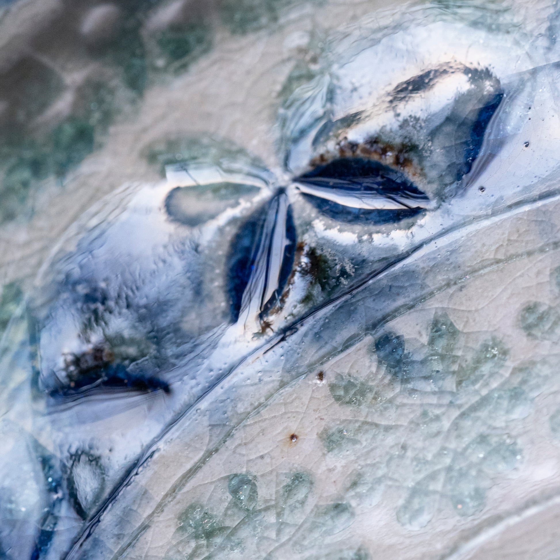 This plate reflects Tomohiro Matsumoto’s mastery of glazing, where ash glaze and zaffer are carefully balanced to create depth without overpowering the clay itself. The underside is left unglazed, allowing the coarse Shigaraki texture to remain present, while gentle imprint patterns add softness and movement across the surface. Crystalline glaze effects and natural firing marks highlight the artist’s skilled control of the kiln.