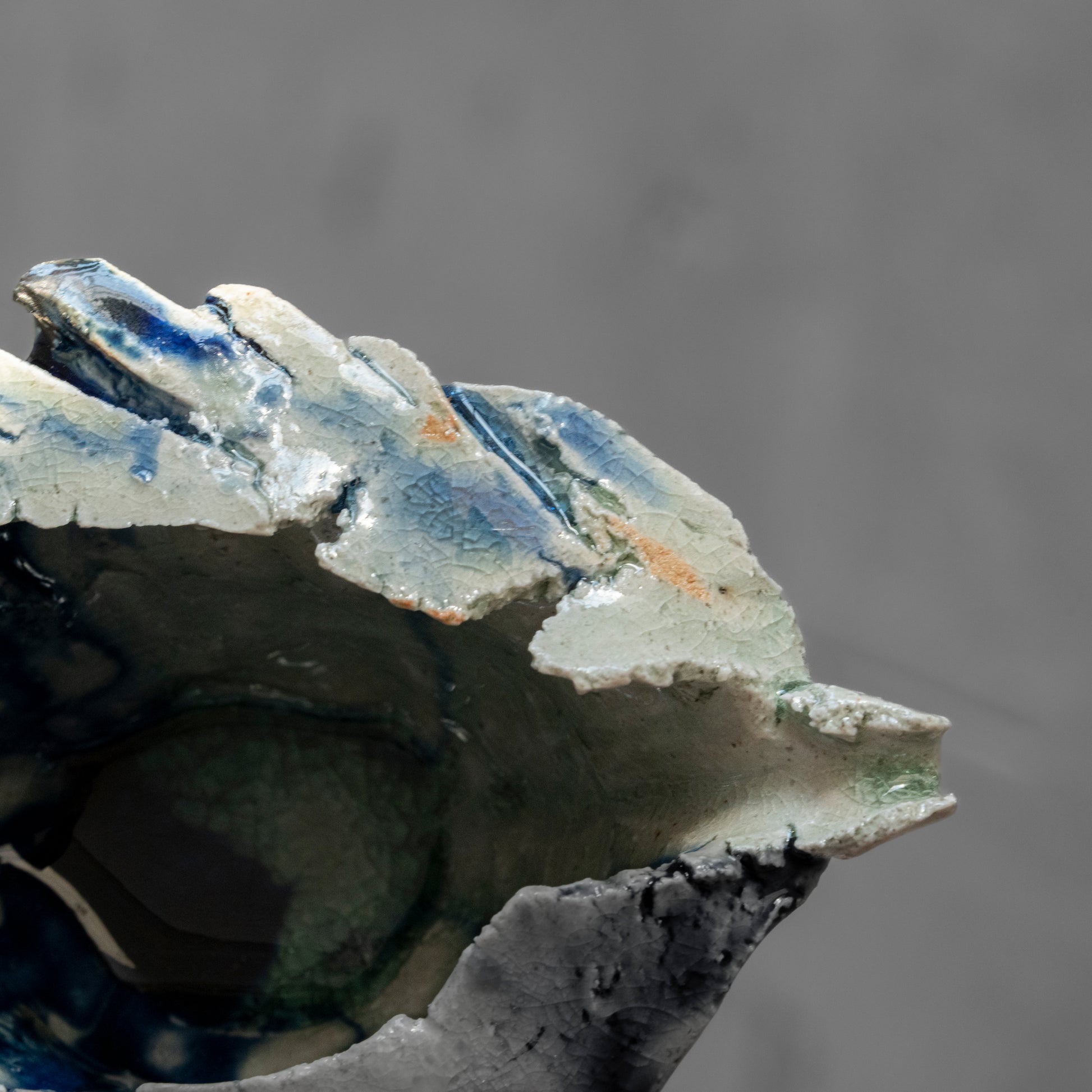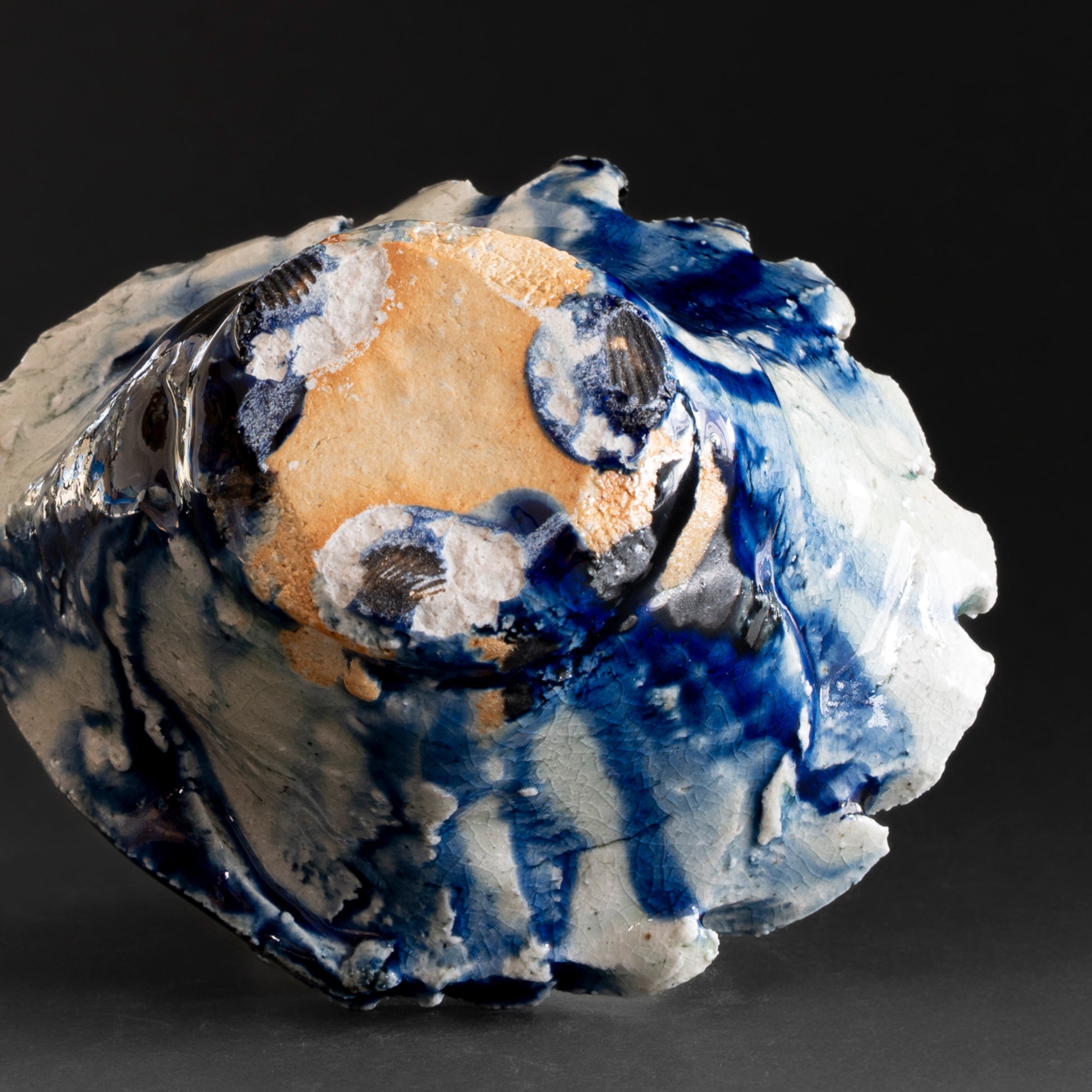 This medium-sized pitcher features Matsumoto’s ash glaze and zaffer layered over Shigaraki clay, with areas of texture intentionally left visible. Sharper edges and subtle dents give the form a more angular presence, while crystalline glaze effects catch and reflect light.