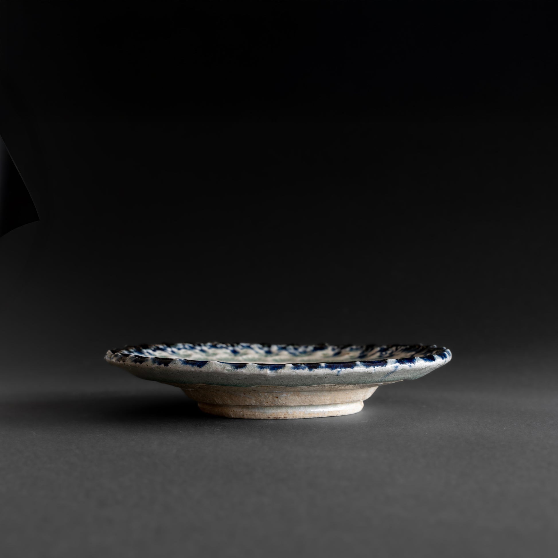 This plate features Matsumoto’s ash glaze and zaffer applied with refined control, paired with an unglazed underside that exposes the coarse texture of Shigaraki clay. Subtle surface patterns add softness and rhythm, balancing the raw material’s strength. Firing marks and crystalline glaze effects give each plate a distinct expression.