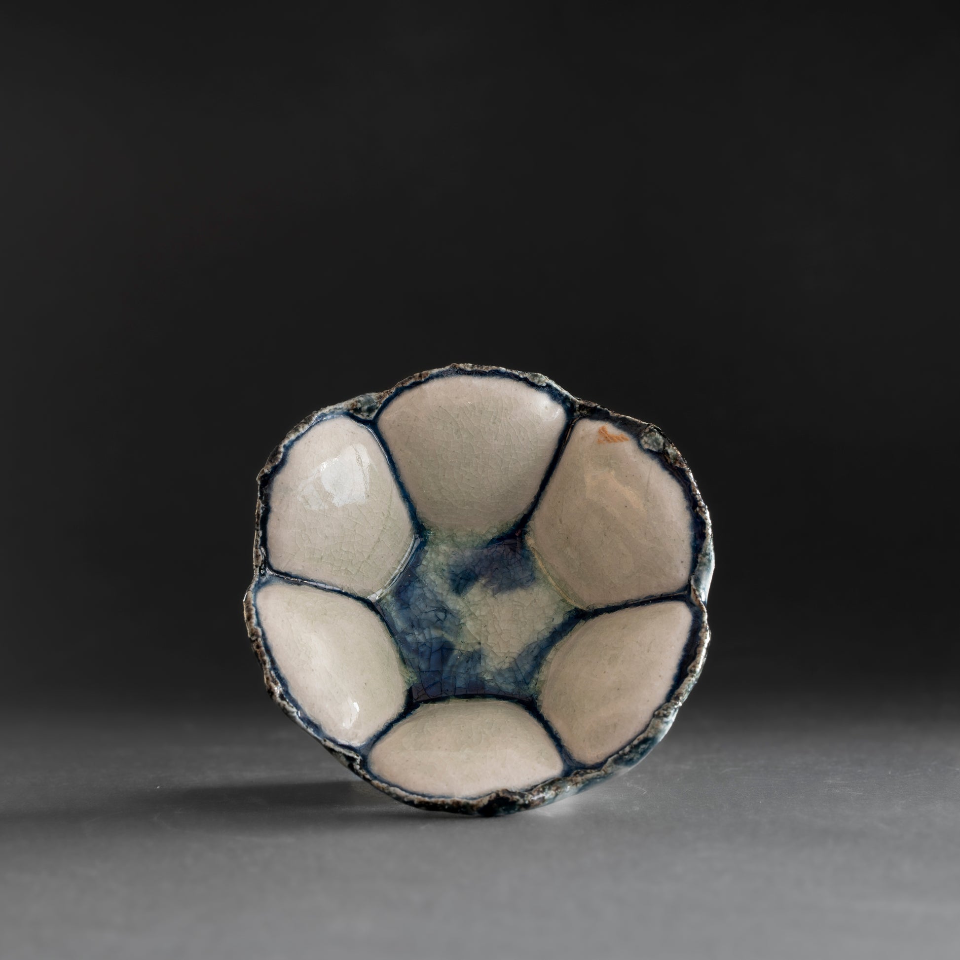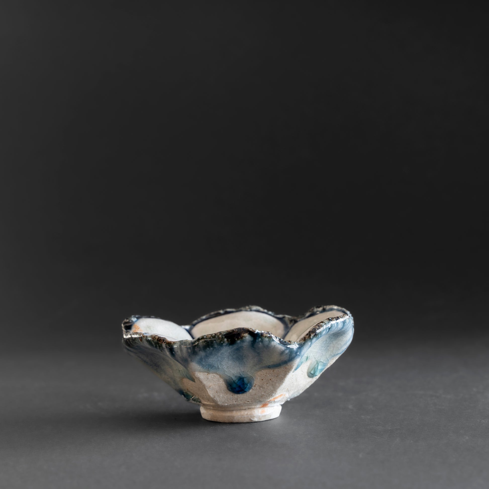 This small bowl features Matsumoto’s ash glaze and zaffer, contrasted by an unglazed base that highlights the clay’s texture. The sculpted form and flowing glaze create a soft yet expressive surface shaped through firing.