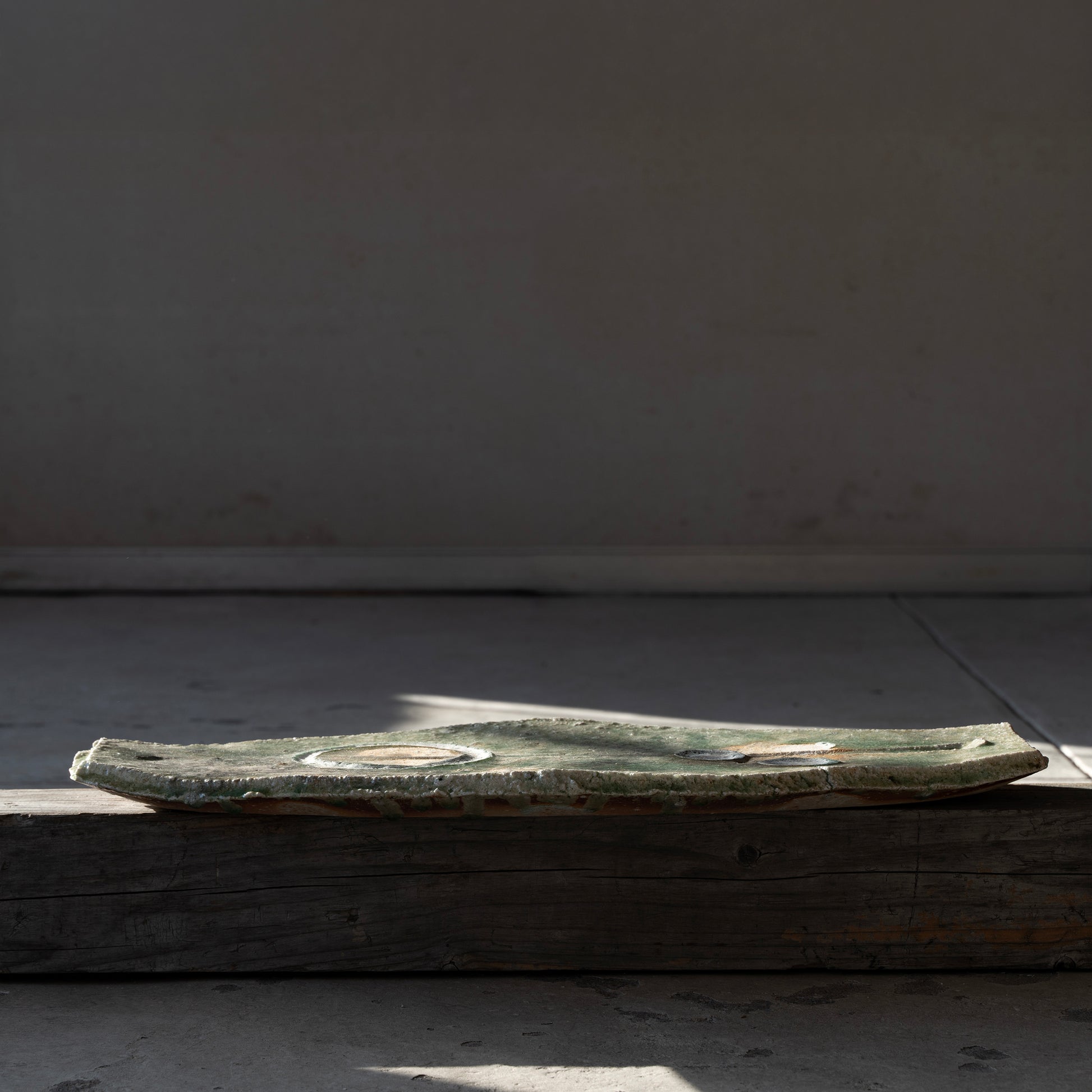 The grey and jade glaze on the piece gives a sense of ruggedness that pairs well with the Shigaraki clay underneath. Shigaraki ware is characterized by its iconic natural color gradient of browns and oranges. The surface often features rustic, rough and earthy textures caused by the existence of feldspar and quartz sand in the clay. You can still see the texture from the unglazed parts on the piece.