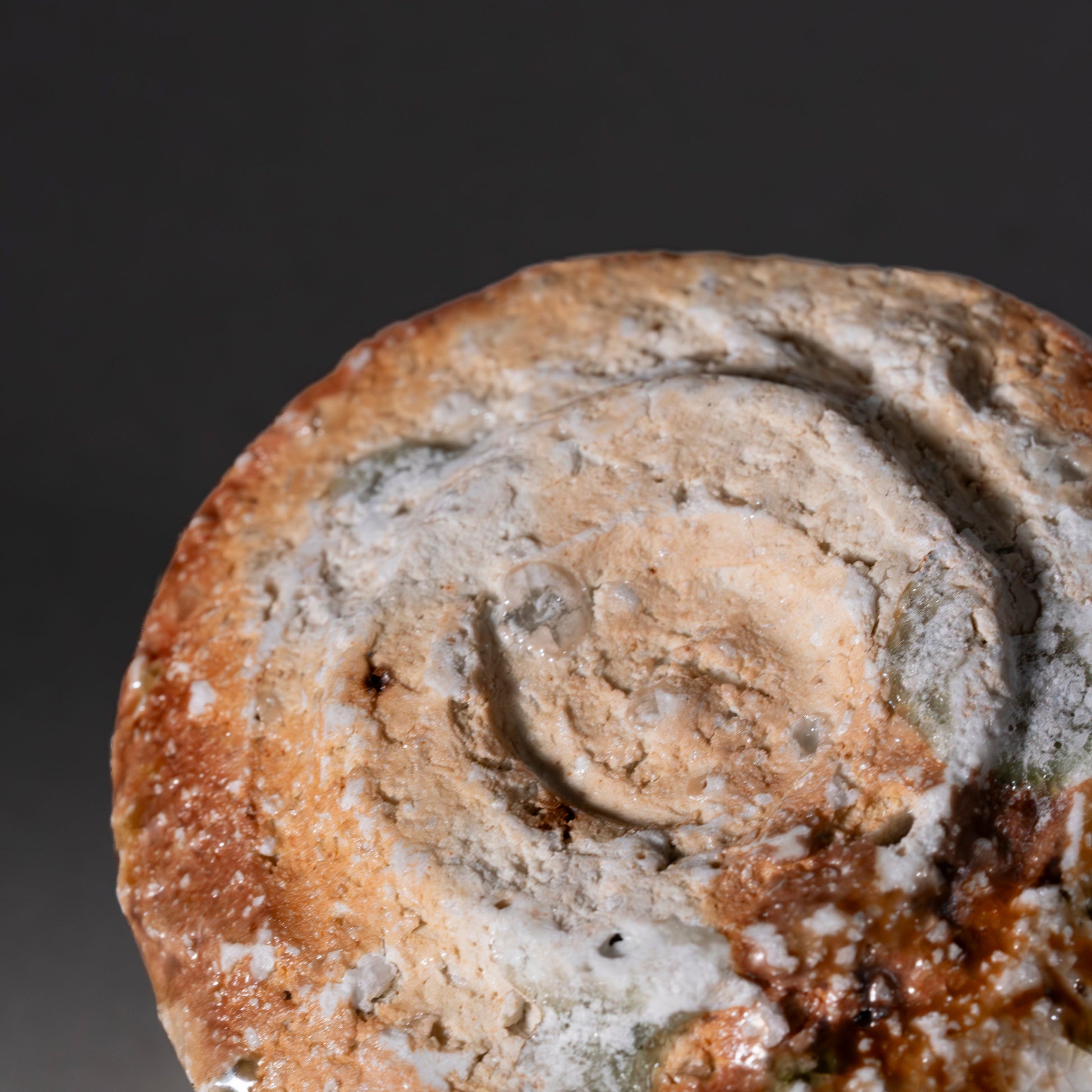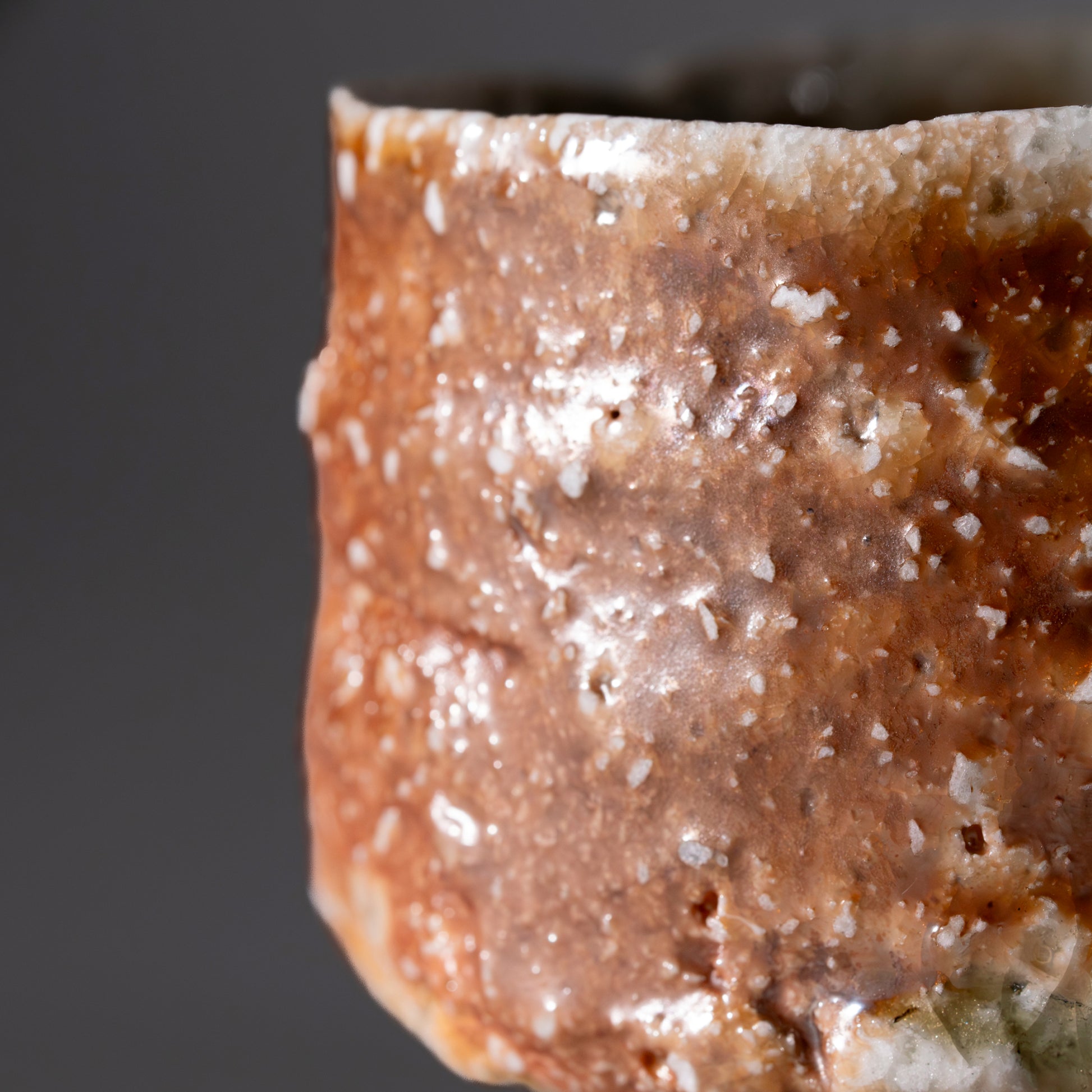 This sake cup features a glazed surface that highlights the natural variations of Shigaraki clay, with soft shifts between brown and orange tones. The clay’s coarse texture remains present beneath the glaze, shaped by the interaction of minerals and high-temperature firing.