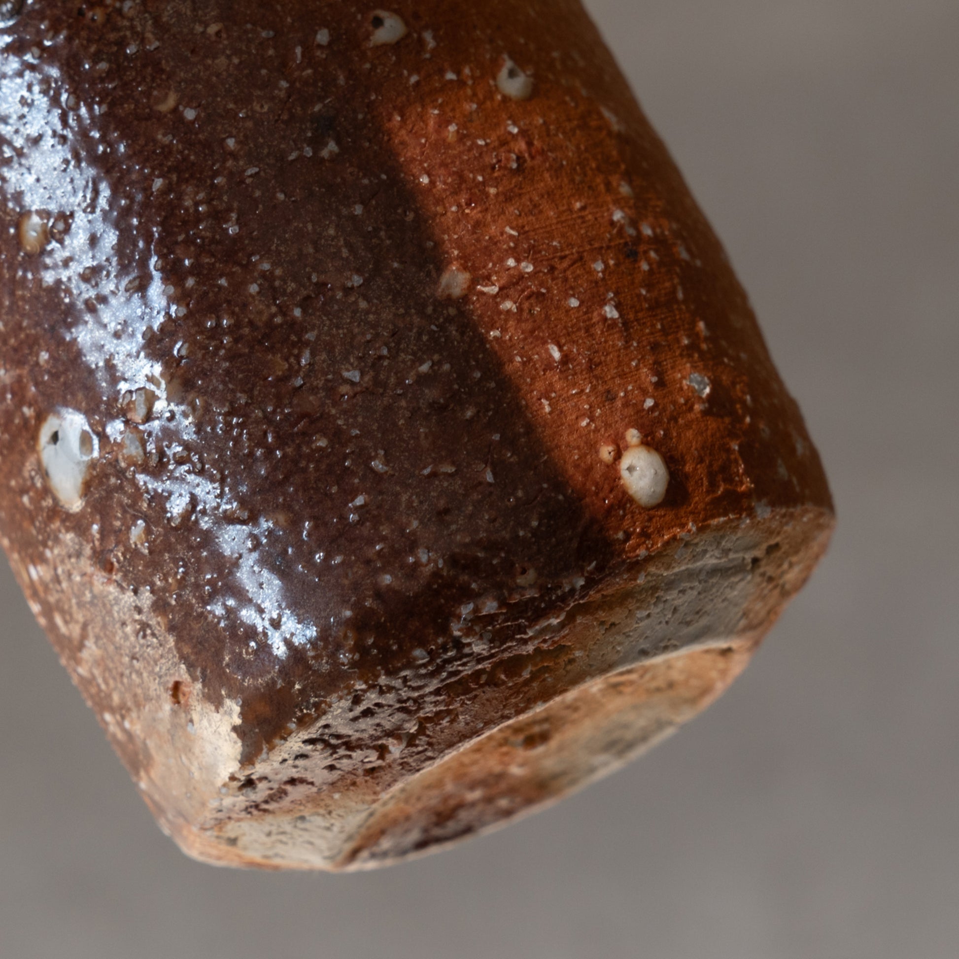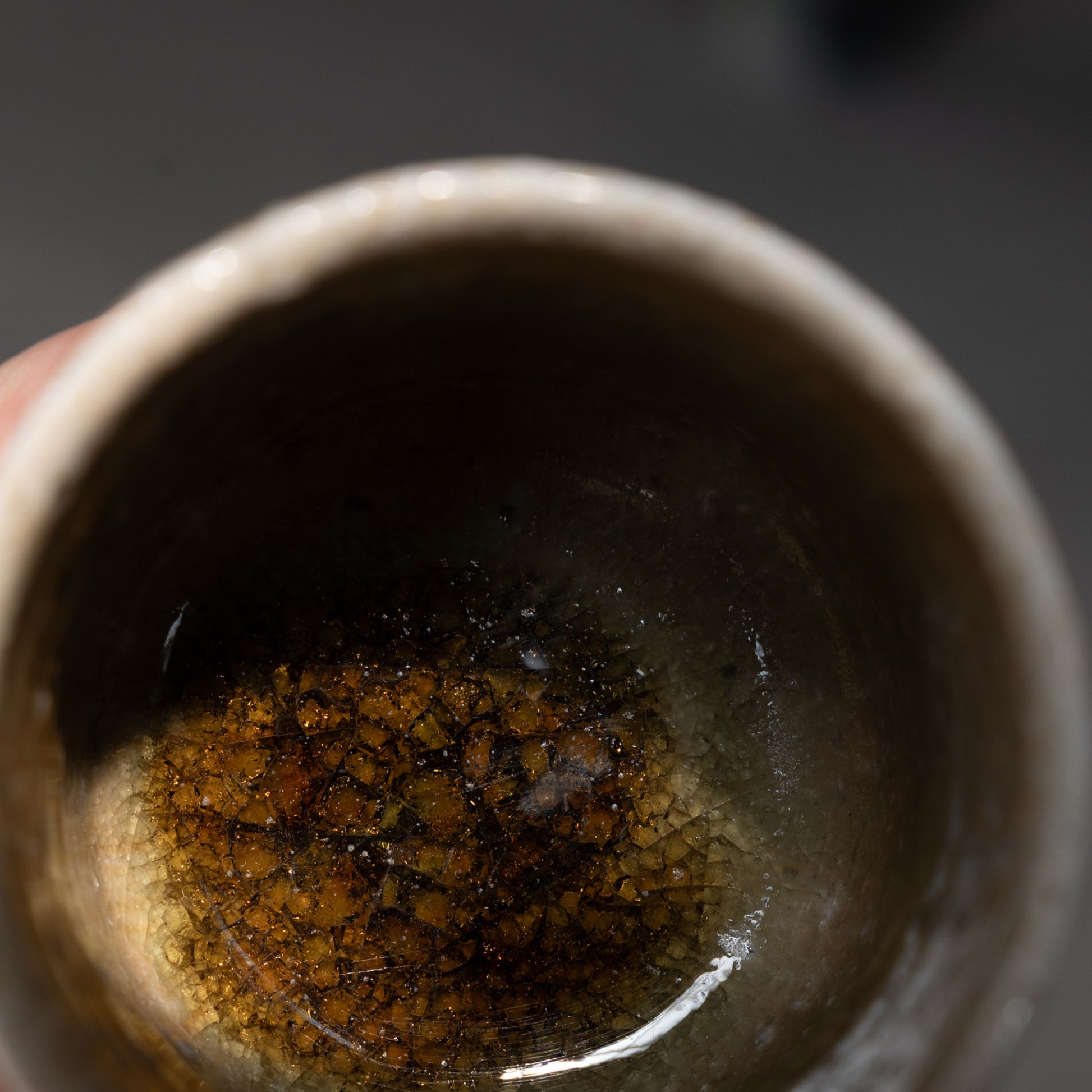 This small tea cup features a glazed surface that retains the earthy character of Shigaraki ware. Natural minerals within the clay produce rough, tactile textures and gentle color variations, while the glaze settles unevenly, preserving the material’s depth and warmth. Subtle firing marks remain visible, reflecting the influence of heat and flame.